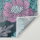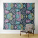 Die Tapisserie ist in lila, blauen und olivgrün-Blume gehalten, umgeben von lila Farnfronten und Blätter auf dunkelblauem Hintergrund.