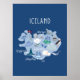 Dunkelblaue Island-Reisekarte. Mit den wichtigsten touristischen Attraktionen, Kultursymbolen und lokalen Tieren.