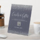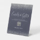 Ein elegantes und elegantes Schild, das die Hochzeitsgäste auf Ihre Karten und Geschenktische lenkt. Der Begriff "Karte & Geschenke" erscheint in silbergrauer Handschrift Kalligraphie auf dunkelblauem Hintergrund. Fügen Sie einen QR-Code hinzu, indem Sie Ihre Website-URL eingeben, um Gäste einzuladen, zu Ihrem Flitterwochenfonds beizutragen. Silber-Imitate Glitzer-Ränder dekorieren die oberen und unteren Ränder.