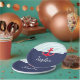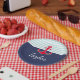 Dunkelblauer Minzestreifen, roter Ankertext Pappteller