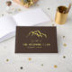 Dunkelbraunes und goldenes Gästebuch für Ihre Berghütte, personalisiert mit dem Namen Ihrer Hütte oder Ihres Firmennamens in rustikalen Goldfolienbriefen unter der Skyline majestätischer Berggipfel. Gästebuch mit Bergen und rustikalen Schriftart in Goldfolie vor tiefbraunem Hintergrund. Rustikales Gästebuch in dunkelbrauner und goldener Folie für Ihre Zuhause, Miet-Kabine oder Gästekabine.
