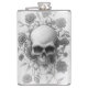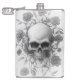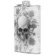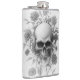 Eine dunkle und gotische Schwarz-Weiß-Darstellung eines kahlweißen Schädels, der in einer Sammlung von schwarzen Rose, toten Blätter und scharfen Dornen ruht.