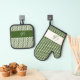 Das Oven-Mitt-Design zeichnet sich durch einen dunkelgrünen Hintergrund mit weißen Polka-Punkten aus. Eine weiße Bar zeigt den Anfang in einem Blau an. Potholder hat das gleiche Design in umgekehrten Farben. Erstellt ein niedliches Aussehen für jede Küche und fügt diese persönliche Touch hinzu.