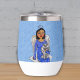 Dieser Getränketuscher hat einen dunkelhaarigen Engel mit blauen Augen, die auf einer weißen Wolke sitzen und eine Engel weiße Katze mit einem blauen Kleid auf himmelblauem Hintergrund tragen.