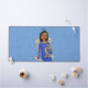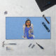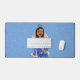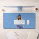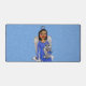 Diese Schreibtischmatte hat einen dunkelhaarigen Engel in einem blauen Kleid mit weißen Sternen, die auf einer Wolke sitzen und eine Katze mit weißem Engel auf himmelblauem Hintergrund halten.