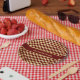 Dunkelrot - Gelb kariert - dunkelrote Hintergrundfarbe, goldene Schachtel, geometrische Gestaltung