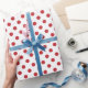 Ein Umhüllungspapier, das mit einem dunkelroten Polka-Punktmuster mit einem mittleren Abstand zwischen den Punkten auf weißem Hintergrund gebaut wurde. Passen Sie den weißen Hintergrund unter anderen Optionen an.