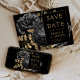 Diese elegante, launische Hochzeit Save the Date-Karte bietet einen üppigen, romantischen Blumenstrauß in Schwarz mit goldenen Imitate-Folie und Glitzer-Blattwerk auf schwarzem Hintergrund. Passen Sie den goldfarbenen Text in stilvollen Schriftart auf einem goldgelben schwarzen Rechteck an, und fügen Sie Ihre Website-URL zu dem soliden schwarzen Rücken.