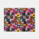 Diese Türmatte hat ein geometrisches Design von Quadraten in braun, schwarz, ziegelrot, gelb, aquamarin, grün, lila, gold, rosa, rot, grau auf einem Feld von leichter grau.