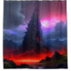 Eine dunkle Szene eines hohen Turms auf einem Felsberg mit Lava.