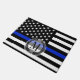 Dünne blaue Linie Art amerikanische Flagge. Eine amerikanische Flagge des Schwarz-weißen und Kobaltblaus symbolisch von der Gesetzdurchführung. Dieses wird auf einer kundenspezifischen Türmatte gekennzeichnet.