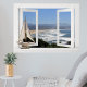 Von diesem Fake-Poster aus hat man einen schönen Blick auf die Ozeanwellen und man hat den Eindruck, durch ein Fenster zu blicken. Die schöne Szene dahinter ist ein Ozean mit großen weißen Wellen, die gegen den Sand des Ufers abstürzen. In der Ferne sieht man eine Berglinie unter einem wolkenlosen blauen Himmel. Auf der Fensterwand dieses weiß gestrichenen Fensters befindet sich ein kleines Segelboot mit Stoffsegeln. Ein idealer Ort für alle, die Lieben segeln, surfen oder einfach nur einen Blick aufs Meer genießen wollen, egal wo sie leben.