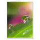 Schöne, vibrierende Makrophotographie der Wassertröpfchen auf einem kleinen Blatt, brechende Blumen im Hintergrund.