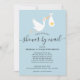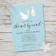 Mit einem niedlichen Storch, der eine ganz besondere Goldsternlieferung trägt, auf einem blauen Hintergrund, ist diese niedliche Babydusche, Sprinkle oder Paardusche auf dem Postweg perfekt für alle Kleinen, die unterwegs sind. Fügen Sie Ihre Feierlichkeiten Details in elegantem Text hinzu, um die perfekte Einladung zu schaffen. Entwickelt von Thisisnotme©