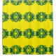 Ein hellgelber Duschvorhang mit gewagtem geometrischem Muster.