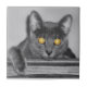Ein Foto, das direkt in das Gesicht einer grauen Katze mit golden leuchtenden Augen schaut. Hergestellt mit selektiver Färbung zur Betonung der faszinierenden Augen.
