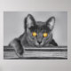 Ein Foto, das direkt in das Gesicht einer grauen Katze mit golden leuchtenden Augen schaut. Hergestellt mit selektiver Färbung zur Betonung der faszinierenden Augen.