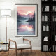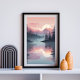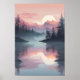 Große, helle Sets, die sich hinter den Ebenen der Rose-getönten Berge verbergen, spiegeln sich perfekt in einem ruhigen See, der von ruhigen Kiefernbäumen gesäumt ist. Diese ruhige Szene ruft Ruhe und Gelassenheit hervor und macht sie zu einem idealen Mauerwerk für Liebhaber von minimaler Naturkunst und beruhigenden Tönen.