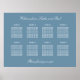 Dusty Blue 8 Table Wedding Chart Poster, bitte personalisieren Sie die Namen des Paares und die Namen der Gäste zusammen mit einem anderen Text, den Sie vielleicht personalisieren möchten. Ein stilvolles Plakat mit elegantem weißem Text auf einem schönen, staubblauen Hintergrund.