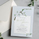 Delikate elegante pastellfarbene hellblaue Blumen Frühjahrsgarten Hochzeitsdusche Einladung mit schlauer grüner Kalligraphie Skript und Blattwerk.