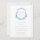 Dusty Blue Bridal Dusche Einladung. Dieses romantische und stilvolle Brautparty besticht durch hübsche handbemalte Aquarellblumen in staubblauen Blumen auf einem Wappen | Kranz mit 'Brautparty' in einem schönen Skript. Auf der Rückseite der Einladung befindet sich ein skurriles Muster, das aber nach Belieben leicht gelöscht werden kann. Suchen Sie passende Elemente in der Dusty Blue Mit Monogramm Wappen Collection.