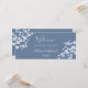 Hochzeitssitzkarte mit blauen Kirschblüten auf einem staubblauen Empfang. Ein Willkommenstext und Ihre Braut- und Bräutigamen in einem eleganten, handgeschriebenen Schriftart.