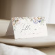 Blütenblaue und cremefarbene Platzkarte mit elegantem Schriftzeichen und den Initialen des Ehepaares auf der Rückseite.