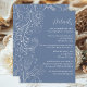 Diese elegante Hochzeitsdetails-Karte kann mit wichtigen Informationen für Ihre Gäste wie Hochzeitsempfang, Hotelunterkunft, Transport, Anfahrtsbeschreibung, Kleiderbekleidung, Reiseroute, Registrierung und mehr personalisiert werden. Das Design zeichnet sich durch ein zartes blumengeschmücktes Dekor aus, mit Blume, Vögeln und Blätter auf einem staubblauen Hintergrund. Der Text kombiniert handgeschriebene Skript- und Serif-Schriftart für ein stilvolles und modernes Aussehen. Ideal für eine Hochzeit im Herbst im Winter oder Herbst.