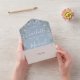 Alles in einer staubblauen Hochzeitseinladung mit hübschem Grün, Blumenbezeichnungen und schicken Typografie. Die Einladung enthält eine perforierte RSVP-Karte, die für Sie individuell adressiert oder links als leere Karte für die Handschrift der Adressdaten Ihres Gastes verwendet werden kann. Entwickelt von Thisisnotme©