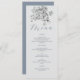 Verbringen Sie Ihre Hochzeitsmahlzeit stilvoll mit diesem eleganten dustigen blauen Menü. Weiche, silberfarbene Aquarellblüten und anmutige Kalligraphie schaffen ein romantisches, raffiniertes Aussehen. Ideal für Winterfeiern oder kleine Hochzeiten, bietet dieses Menü eine delikate Touch von Natur inspiriert Charme in Ihrem Empfang-Tisch.