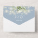 Alles in einer staubblauen Hochzeitseinladung mit botanischem Grün, Lichtern und eleganter Typografie. Die Einladung enthält eine perforierte RSVP-Karte mit Ihrem Hochzeitswebseiten QR Code und Details. Entwickelt von Thisisnotme©