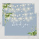 Eine elegante Eukalyptusgrün botanische Saitenleuchten bedanken sich durch Ihre Karte, personalisiert mit einer besonderen Botschaft auf der Rückseite auf einem staubigen blauen Hintergrund. Entwickelt von Thisisnotme©