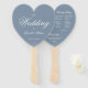 Ein schlichter, aber eleganter, herzförmiger Hochzeitsfan für ein staubblaues Hochzeitsthema. Der Hintergrund ist staubblau, der Text weiß. Die Titel und die Namen (und die Initialen) der Braut und des Bräutigams sind in einem eleganten kalligrafischen Skript, der Erholung in Kappen, geschrieben. Auf der Rückseite hat es auf der links Seite das Trauungsprogramm und, auf der rechten Seite, die Hochzeitsfeier (mit 2 verschiedenen Säulen für die Brautmannschaft und Bräutigam Team). und unter ihnen eine kurze Dankeschön Nachricht.