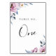 Modernes und elegantes Typografie-Design, Tischnummer-Karte. Die Karte bietet elegante Aquarellrahmen mit Blumen- und Blattmotiven in Lila-, Weiß- und staubblauen Farbtönen. Bei der Bestellung von Tischnummern muss jede Karte nummeriert und einzeln bestellt werden.