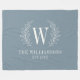 Ein hübsches Lorbeer-Blatt-Monogramm schmückt diese staubige blaue Fleecedecke. Ein tolles Geschenk für eine Hochzeit oder ein Jubiläum.
