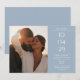 Eine moderne minimalistische rett-the-date-Karte mit Ihrem besonderen Datum, Foto und Hochzeitsdetails Set in klassischer, schicke Typografie auf staubblauem Hintergrund. Entwickelt von Thisisnotme©