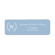 Dusty blue colored background. Decorated with a white wreath. Personalize and add your name, address and family monogram initial. White colored text.