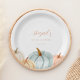 Dusty Blue Pumpkin Brautparty Paper Teller. Diese Teller sind mit einem Aquarellkürbis-Design versehen. Die Einrichtung besteht aus farbenfrohen, orangefarbenen, staubblauen, Terrakotta- und beigefarbenen Tönen. Der perfekte Teller für ein Brautparty im Herbst.