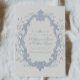 This is a dusty blue Save the Date featuring a rococo style floral frame and classic serif fonts. Most wording can be edited to fit your plans, including names, date, and location. The design has a calm, romantic feel and works well with a variety of wedding styles.