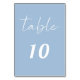 Personalize and your table numbers one by one. A dusty blue colored background. White text.