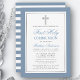Moderne Elegante Dusty Blau und Silber Erste Heilige Kommunion Einladung mit Kreuz. Streifen zurück.