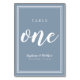 Dieses Design wurde für kleinere intime Hochzeitsfeiern geschaffen. Das einfache, minimalistische und elegante Design der Wedding Tischnummer ONE besticht durch ein zeitgenössisches Design mit einem doppelten Rahmen in knalligem Weiß auf einem staubblauen Hintergrund. Das schicke Design bietet zeitlose und moderne Eleganz. Persönliche Gestaltung der Hochzeitstische mit Ihren Hochzeitsdetails in knackiger weißer Schrift und Schrift. Die Rückseite der Karte ist ein Duplikat der Vorderseite. Bestellen Sie einen für jeden Tisch mit den einzelnen Tischnummern. Die Tische 1 bis 10 sind individuell gestaltet und sind in meinem Geschäft "InvitationSuites" auf Zazzle erhältlich. Während Sie speziell für einen kleineren Veranstaltungsort erstellt wurden, senden Sie uns bitte eine E-Mail an InvitationSuites@gmail.com .