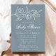 Elegante Blumendusche mit weißgestrichenen Blume und Blätter in der Nähe der Oberseite der Einladung mit einem staubigen blauen Hintergrund. Persönlich gestalten Sie die botanische Babydusche mit dem Namen der Mutter und den unten stehenden Duschdetails in klassisch weißer Schrift.