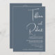 Set den Ton für Ihren besonderen Tag mit der Dusty Blue Wedding Einladung. Mit einem ruhigen, staubblauen Hintergrund und eleganten weißen Schriftzeichen präsentiert diese Einladung die Namen der Paare, das Hochzeitstag und den Veranstaltungsort auf der Vorderseite. Auf der Rückseite finden Sie zusätzliche Details für Ihre Gäste, die alles behalten haben, was für ein stilvolles Ambiente sorgt. Ideal für moderne, klassische oder romantische Hochzeiten, bringt diese Einladung ein elegantes, zeitloses Ambiente in Ihre Hochzeitsstätte.