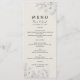 Elegantes, modernes, botanisch staubblaues Hochzeitsmenü mit Imitaten silberblühenden Spitzen und einfacher Kalligraphie-Schrift.