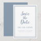 Mit unserer modernen und schlichten, staubblauen und weißen Save the Date Hochzeitsankündigung verkünden Sie Ihre Veranstaltung! Die Einladungs-Suite besticht durch ein minimalistisches Design mit einem doppelten Rahmen in trendigem staubblauem, weißem Hintergrund. Traditionelle Formulierungen bieten zeitlose, aber moderne Eleganz. Personalisieren Sie das Hochzeitsdesign mit Ihren Vornamen und Datum in trendigem, staubblauem Schriftsatz. Die Rückseite der Karte passt gut zu solidem staubblauem Blau.