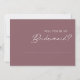 Cette carte de proposition de femme de chambre Dusty Boho Purple & rose est parfaite pour votre mariage boho rustique coloré. Son design moderne simple et unique, accompagné d'un script minimaliste contemporain, d'un rose poussiéreux et d'une palette de couleurs violettes, donne à ce produit une atmosphère bohème chic classique. Gardez-le tel quel, ou choisissez de le personnaliser avec des illustrations ou des graphiques de votre choix. Vous pouvez également chercher d'autres produits dans cette collection pour réunir votre mariage entier !