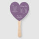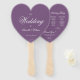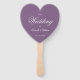 Ein schlichter, eleganter, herzförmiger Hochzeitsfan für eine staubige lila Hochzeitsfarbe. Die Titel und die Namen (und die Initialen) der Braut und des Bräutigams sind in einem eleganten kalligrafischen Skript, der Erholung in Kappen, geschrieben. Der Hintergrund ist staubig lila, der Text ist weiß. Auf der Rückseite hat es auf der links Seite das Trauungsprogramm und, auf der rechten Seite, die Hochzeitsfeier (mit 2 verschiedenen Säulen für die Brautmannschaft und Bräutigam Team). und unter ihnen eine kurze Dankeschön Nachricht.