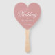 Ein schlichter, aber eleganter, herzförmiger Hochzeitsfan für eine Hochzeitsfeier, die eine staubige Rose als Hochzeitsfarbe hat. Der Hintergrund ist staubige Rose, der Text ist weiß. Die Titel und die Namen (und die Initialen) der Braut und des Bräutigams sind in einem eleganten kalligrafischen Skript, der Erholung in Kappen, geschrieben. Auf der Rückseite hat es auf der links Seite das Trauungsprogramm und, auf der rechten Seite, die Hochzeitsfeier (mit 2 verschiedenen Säulen für die Brautmannschaft und Bräutigam Team). und unter ihnen eine kurze Dankeschön Nachricht.