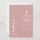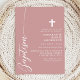 Feiern Sie den heiligen Anlass einer Taufe mit dieser eleganten staubigen Rose rosa Einladung. Mit einem minimalistischen Design mit modernem Drehbuch und einem delikaten Kreuz lädt diese Einladung Freunde und Familie zu diesem besonderen Ereignis ein. Die sanfte Farbe und die schlichten, sauberen Linien verleihen dem Hotel eine Touch von Eleganz und Anmut, die es zu einem so bedeutsamen Fest macht. Passen Sie die Details an, um eine einzigartige und unvergessliche Einladung für die Taufe Ihres Kindes zu schaffen.